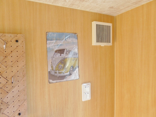 標準で換気扇、LEDライト、窓、扉、コンセント、外部コンセント、弾力フロア等